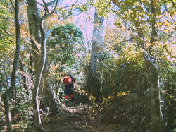 日差しの差し込む灌木の中、紅葉を楽しみながら尾根道を歩く。 −22− |