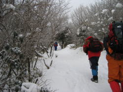 登山道の雪は踏み固められているので、はまり込むことはありませんが、登山道の両脇は4、50cmほど積もっていて膝小僧くらいまではまり込みました。 −9− |