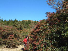 登山口から少し入ったところから見る鞍岳の山頂です。 アシビの木々の中を進みますが、山頂はすぐそこといった感じです。 |