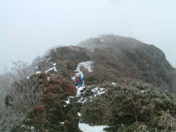 山頂に近づくにつれて山肌はなだらかになり、どこが山頂なのかはっきりしなくなる。 前方には阿蘇山が目の前に見えるはずだが、雲海の中に高岳のみ頭を出している。 −21− |
