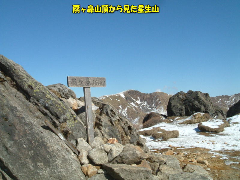 雪道を登りきると一度平らな尾根に出て、その向こうに岩肌のある扇ヶ鼻山頂が見える。 −27− |