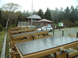 | 富士見峠の公衆トイレと、太陽熱発電装置です。 右手前に富士見小屋がありますが、関係者の車はここ(約1,920m)までも登ってきているので、びっくりしました。 09:30 |