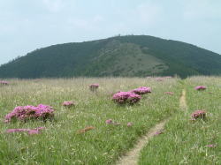 灌木の中の登山道はあまり長くなく、やがて草原の中を登るようになります。 傍らにはミヤマキリシマの花が咲いていました。 −5− |