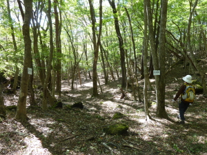 登山口から50分あまりで、日向越えの分岐点に出ます。 ここまで急な上りやロープなどもなく、楽しく登ってこられるので、散策するのも良いと思います。 −7− |