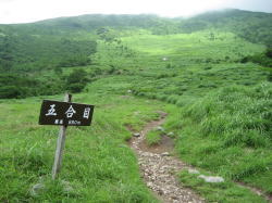四合目からは少し灌木の中を歩き五合目の草原に出てきました。 標高は880m、あと500mほどで山頂なのですが、疲れがひどくなってきました。 ここまで車が来るのか、ジュースなどの自動販売機がありました。 −12− |