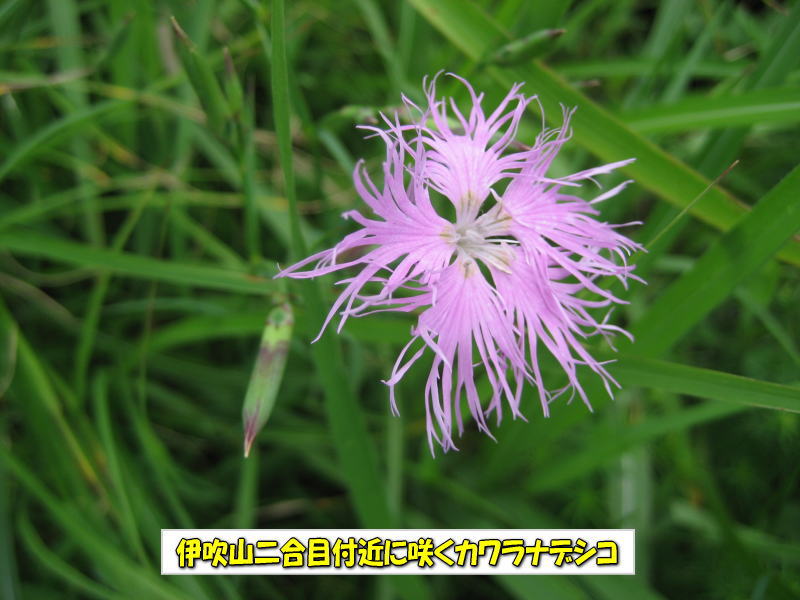 | 二合目あたりでカワラナデシコ | 三合目付近でウツボグサ | 山頂手前のミヤマコアザミ | 4合目付近のグンナイフウロ |