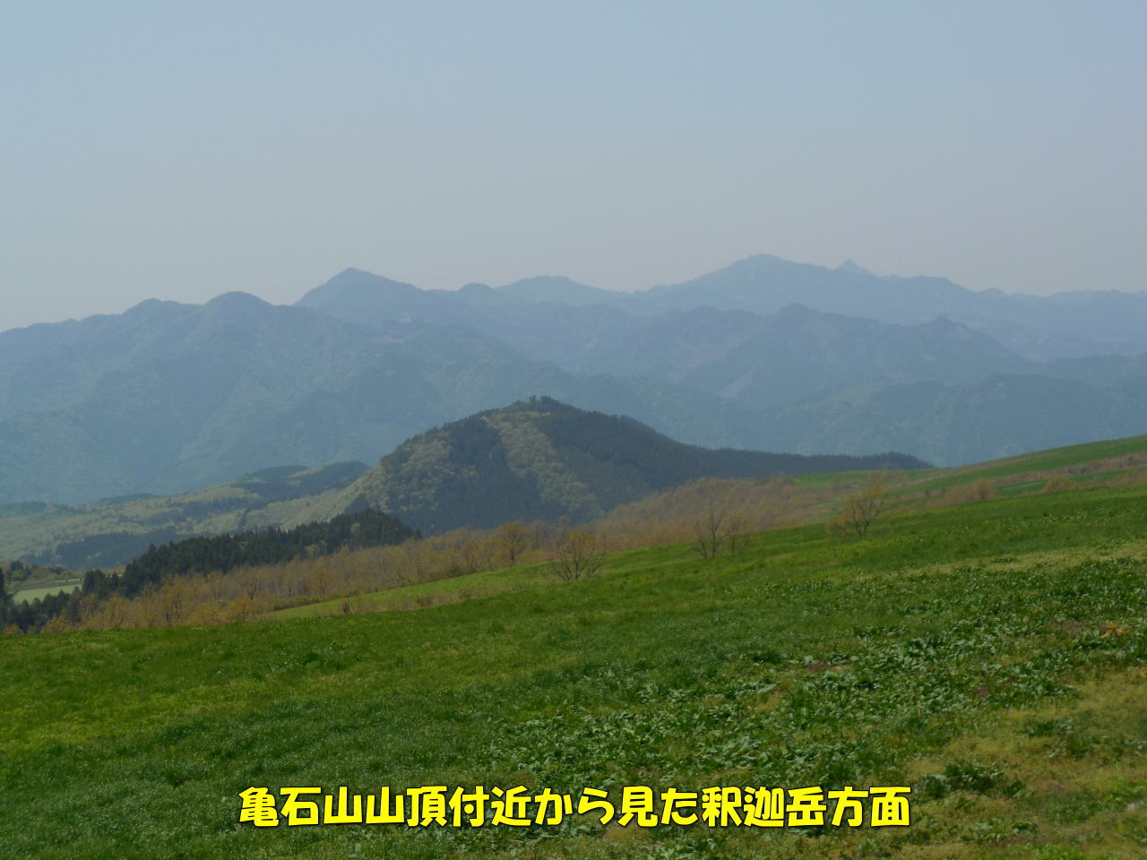 山頂から西方向に下っていく踏み分け道もあり、下っていくと上部の分岐から左に上ったところの広場に降りることができます。 このあたりから登山口の亀石峠も見渡せます。 −18− |
