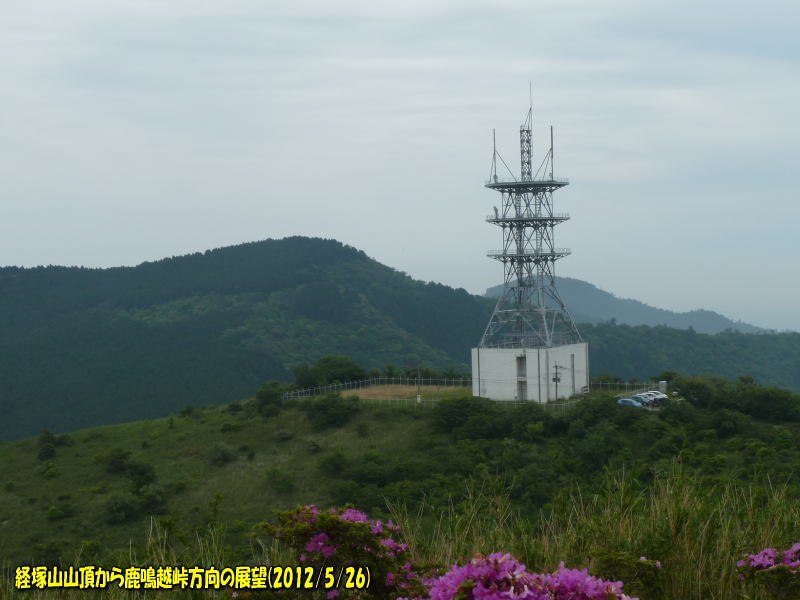 山頂から見た中継塔と七ツ石山など鹿鳴越峠付近の山々 山頂にはミヤマキリシマの説明案内板が設置されていました。 −10− |